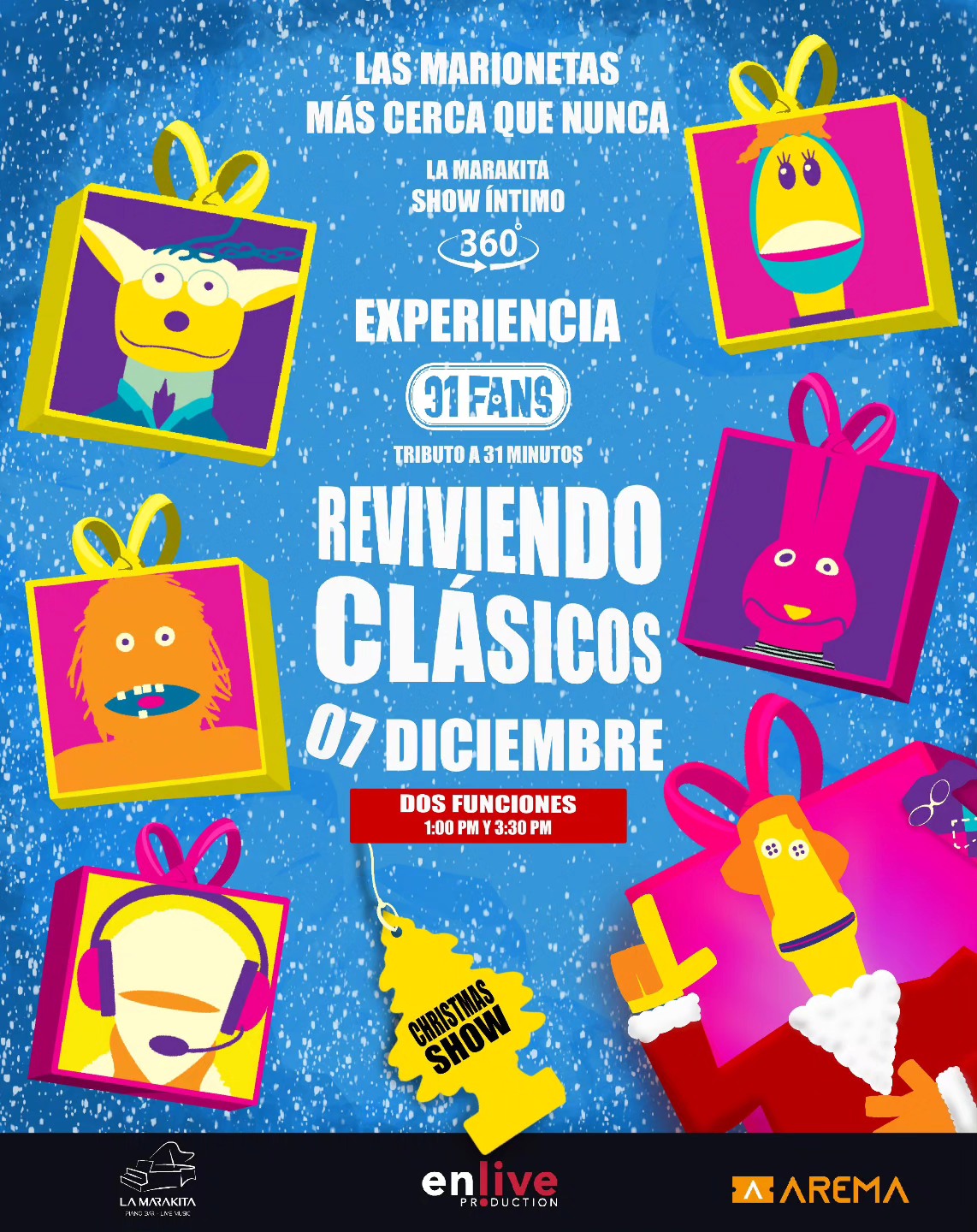 La nostalgia, el humor y la música que definieron a “31 Minutos” volverán a sentirse muy cerca del público este domingo 7 de diciembre, cuando el colectivo 31Fans presente un homenaje especial en La Marakita, el recinto alterno ubicado a un costado de La Maraka. Se trata de un espectáculo íntimo y completamente envolvente, diseñado en formato 360 grados, que ofrecerá dos funciones —a las 13:00 y a las 15:30 horas— para que las familias puedan revivir los clásicos del noticiero más querido de Latinoamérica, ahora con un guiño a la Navidad que comienza a sentirse en la ciudad. En todo momento, la producción invita al público a asegurar su lugar cuanto antes, pues los boletos ya se encuentran disponibles a través de AREMA MX, el único sistema oficial para acceder a este tributo.