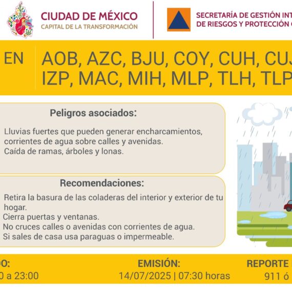 Este lunes 14 de julio lloverá en la Ciudad de México (CDMX), por ello la Secretaría de Gestión Integral de Riesgos y Protección Civil...