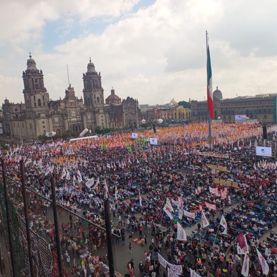 El Zócalo de la Ciudad de México se encuentra lleno de simpatizantes de Claudia Sheinbaum que acuden para la presentación del mensaje...