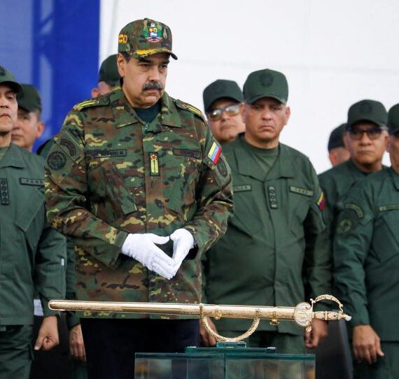 El presidente de Venezuela, Nicolás Maduro, se encuentra cerca de la espada de Simón Bolívar mientras se dirige a miembros de las...