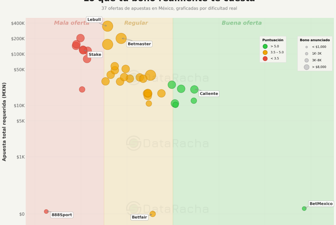DataRacha, firma de análisis deportivo con sede en Berlín, ha publicado su primer índice de transparencia sobre bonos de bienvenida en el mercado de apuestas deportivas en México. El estudio examina las condiciones asociadas a estas promociones a partir de una muestra de ofertas disponibles en el país