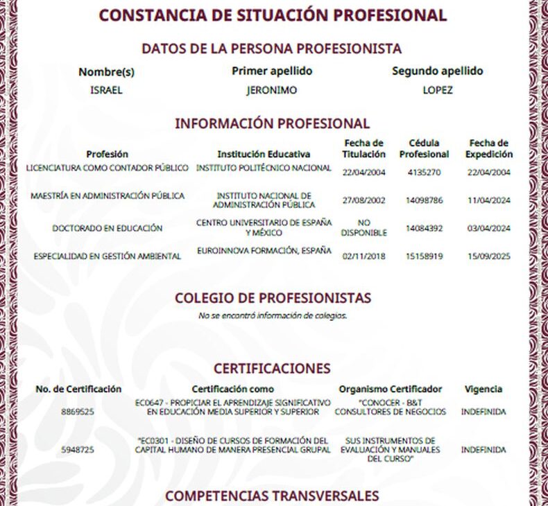 Aún más grave: en documentos oficiales del Gobierno del Estado de México fechados el 22 de septiembre de 2022, el funcionario firmó como “Dr. Israel Jerónimo López”, cuando se desempeñaba como subsecretario de Educación Media Superior. Sin embargo, el portal oficial de la SEP indica que su Doctorado en Educación (cédula 14084392) fue expedido hasta abril de 2024, dos años después de haberse ostentado con ese grado.