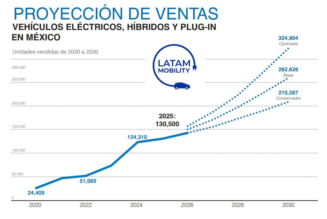 De acuerdo con las proyecciones de Latam Mobility, México podría alcanzar distintos escenarios de crecimiento hacia 2030: uno conservador, con un crecimiento anual de 10%, llevaría el mercado a 210,287 unidades; y un escenario optimista, con un avance de 20% anual, podría superar las 324,904 unidades.