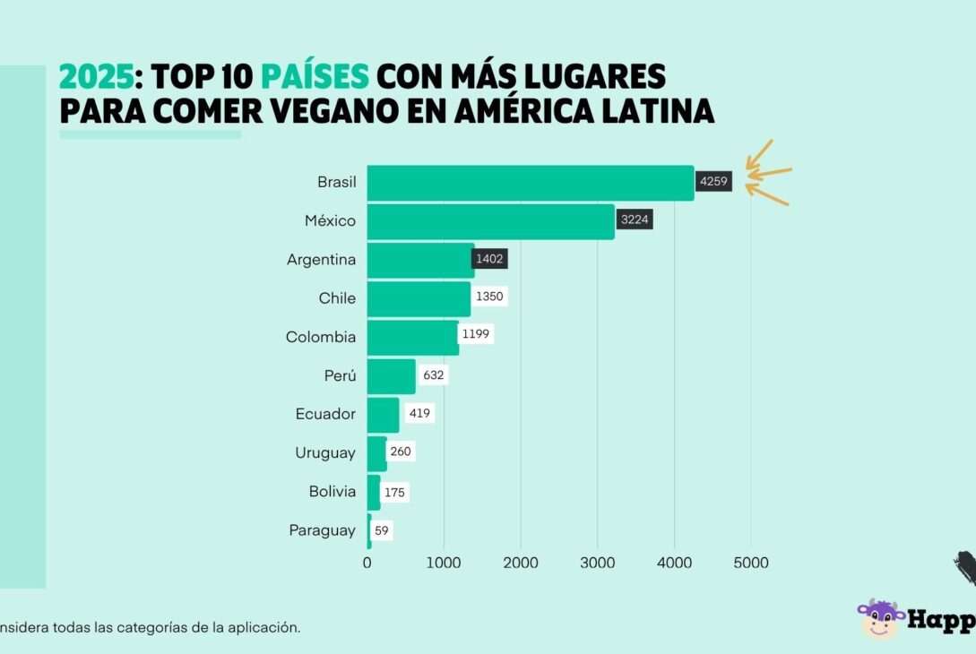 Brasil encabeza el ranking con 4.259 lugares con opciones veganas, seguido por México con 3.224 y Argentina con 1.402. Chile y Colombia completan el top cinco.