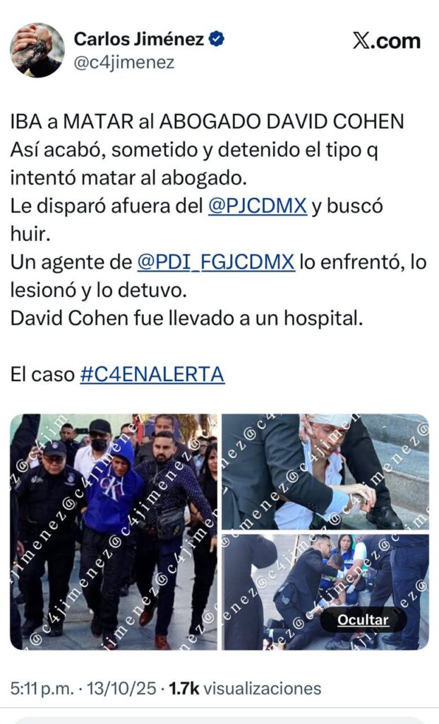 Un joven de 18 años, identificado como Héctor “N”, le disparó con un arma corta a la cabeza. El litigante fue trasladado a un hospital, donde falleció más tarde, confirmó la Fiscalía General de Justicia de la Ciudad de México (FGJCDMX).