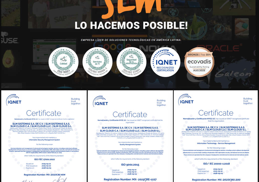 Con presencia en México, Colombia, Venezuela, Estados Unidos y España, SLM se certifica en calidad, seguridad de la información y gestión de servicios, consolidando su compromiso con la excelencia operativa y la confianza tecnológica global